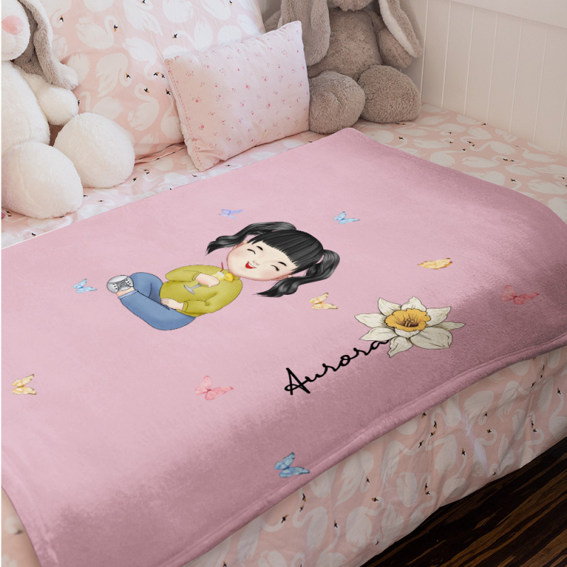 Personalized Cute Cartoon Character Heart Birth Flower Soft Throw Blanket with Name Birthday Christmas Gift